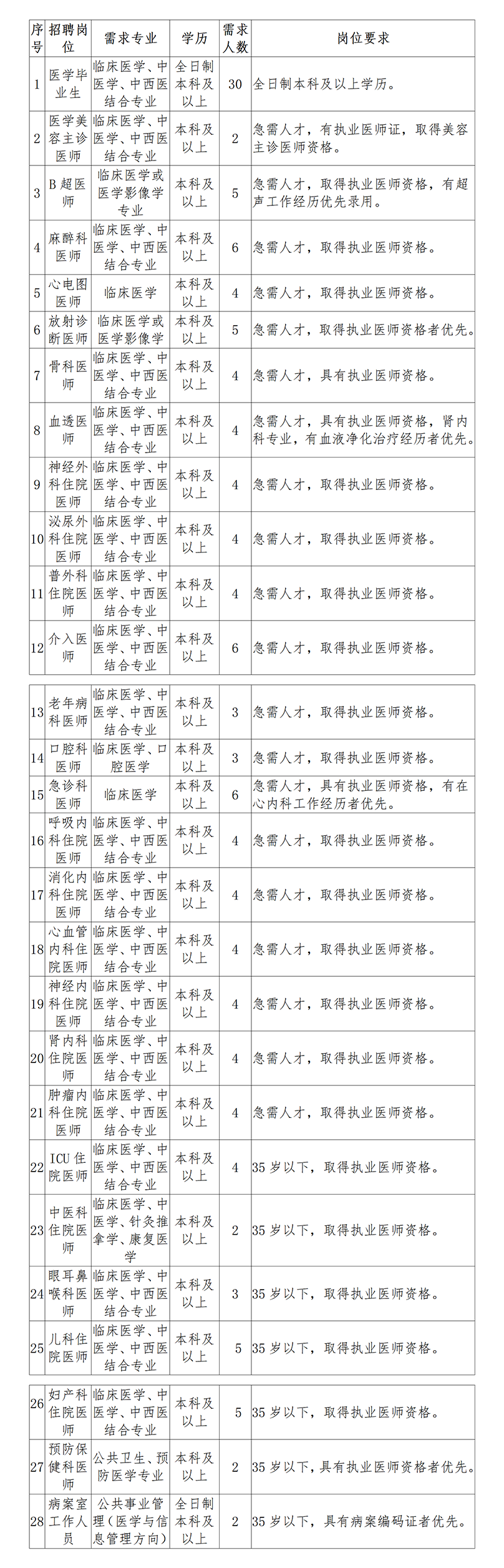 2022年醫(yī)院急需緊缺崗位包括:B超醫(yī)師、麻醉科醫(yī)師、心電圖醫(yī)師、放射科診斷醫(yī)師、骨科醫(yī)師、血透醫(yī)師、神經(jīng)外科住院醫(yī)師、泌尿外科住院醫(yī)師、普外科住院醫(yī)師、呼吸內(nèi)科住院醫(yī)師、消化內(nèi)科住院醫(yī)師、心血管內(nèi)科住院醫(yī)師、神經(jīng)內(nèi)科住院醫(yī)師、腫瘤內(nèi)科住院醫(yī)師、介入醫(yī)師、老年病科醫(yī)師、口腔科醫(yī)師。