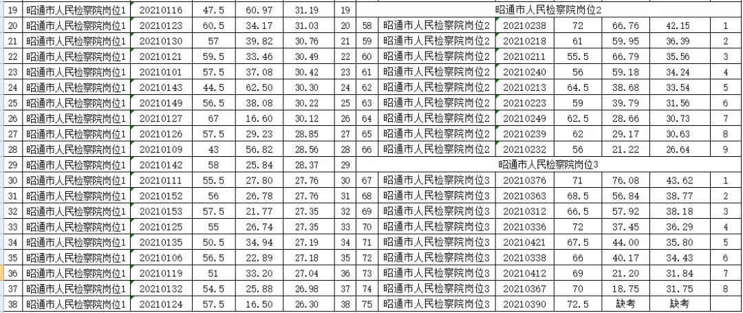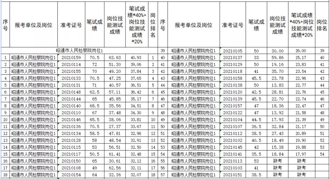 根據(jù)《昭通市人民檢察院2021年合同制輔警招聘公告》要求,昭通市人民檢察院考生于2021年12月31日進行了崗位技能測試,現(xiàn)已完成昭通市人民檢察院2021年公開招聘合同制輔警崗位技能測試成績的復(fù)核工作,現(xiàn)按照各考生筆試成績*40%+崗位技能測試成績*20%的綜合成績從高分到低分依次確定進行排序,并公布如下: