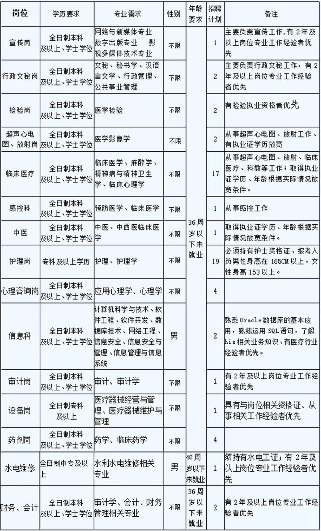 此次計劃招聘60名,包括心理學(xué)、臨床醫(yī)療崗、護(hù)理、藥劑、設(shè)備管理、文秘宣傳、計算機信息等崗位。