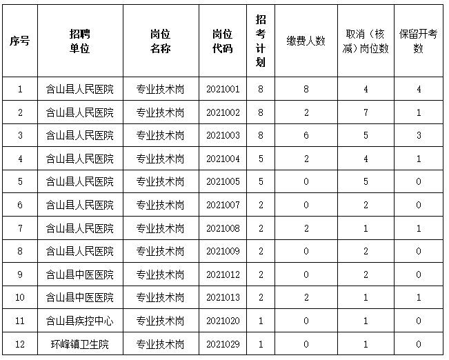 根據(jù)《2021年含山縣醫(yī)療衛(wèi)生事業(yè)單位公開招聘工作人員公告》和現(xiàn)場報名情況,經(jīng)審核確認(rèn),下列招聘崗位因報名人數(shù)不足規(guī)定開考比例予以核減或取消(見附件)。