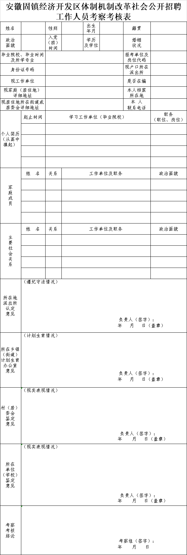 附件:《安徽固鎮(zhèn)經(jīng)濟開發(fā)區(qū)體制機制改革社會公開招聘工作人員考察考核表》