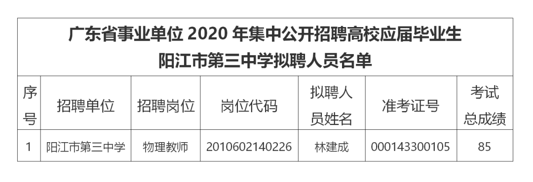 廣東省事業(yè)單位2020年集中公開(kāi)招聘高校應(yīng)屆畢業(yè)生陽(yáng)江市第三中學(xué)擬聘用人員公示
