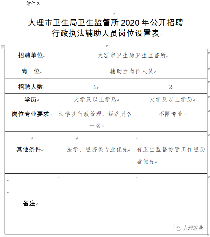 2.大理市衛(wèi)生局衛(wèi)生監(jiān)督所2020年公開招聘行政執(zhí)法輔助人員崗位設(shè)置表