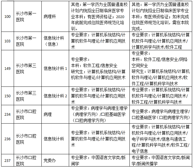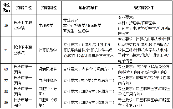 為進一步做好2020年長沙市衛(wèi)生健康委員會直屬事業(yè)單位公開招聘工作,使更多符合條件的優(yōu)秀人才報考,根據(jù)《湖南省2020年考試錄用公務員專業(yè)指導目錄》中專業(yè)調整情況,結合招聘單位實際,現(xiàn)對部分招聘崗位的招聘條件予以調整。