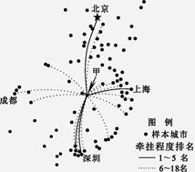 圖11為某網(wǎng)上商城通過(guò)大數(shù)據(jù)分析繪制的“城市牽掛”示意圖。由于遷出人口比例較高,甲地網(wǎng)購(gòu)收貨量中,從異地下訂單的寄達(dá)商品所占比例最高,從而成為2014年全國(guó)最受異地牽掛的城市。讀圖11回答第22小題。