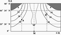 圖13表示一年中大氣上界單位面積水平面上每日接收到的太陽(yáng)輻射隨緯度的變化(單位為MJ/m2 ),圖中陰影部分表示沒(méi)有太陽(yáng)輻射?;卮鸬?5~26小題。
