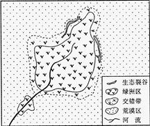 綠洲與荒漠的交錯(cuò)帶生態(tài)環(huán)境脆弱,在其附近的綠洲區(qū)過(guò)量開(kāi)采地下水會(huì)使交錯(cuò)帶生態(tài)環(huán)境退化,形成“生態(tài)裂谷”。圖15為“生態(tài)裂谷”分布示意圖。讀圖回答第29~30小題。