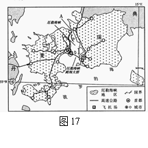 位于瑞典和丹麥兩國(guó)交界處的厄加勒斯海峽地區(qū)擁有多所著名大學(xué),當(dāng)?shù)卣ㄟ^(guò)多種方式支持產(chǎn)學(xué)研合作項(xiàng)目,促進(jìn)了生命科學(xué)、生物技術(shù)、醫(yī)療技術(shù)和醫(yī)藥技術(shù)等產(chǎn)業(yè)的集聚發(fā)展。目前,該地區(qū)已成為歐洲著名的“醫(yī)藥谷”。2000年,厄加勒斯海峽跨海大橋建成通車(chē)。圖17為厄加勒斯海峽地區(qū)及周邊區(qū)域圖。