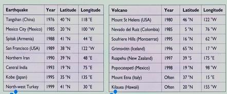 1. 閱讀近幾年發(fā)生的主要火山、地震的表格,根據(jù)表中提供的經(jīng)緯度,在地圖上找到它們的準(zhǔn)確位置。在一張世界空白圖上把它們標(biāo)注出來(lái)。