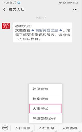 1.打開微信搜索并關(guān)注遵義人社官方微信公眾號(hào),點(diǎn)擊人社查詢內(nèi)的人事考試模塊。