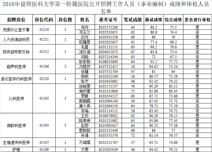 根據(jù)《2018年云南省衛(wèi)生和計(jì)劃生育委員會(huì)所屬事業(yè)單位面向社會(huì)公開(kāi)招聘工作人員公告》的相關(guān)要求,我院于2018年7月31日組成專(zhuān)家考核組對(duì)通過(guò)機(jī)考、現(xiàn)場(chǎng)資格審核合格的人員進(jìn)行了面試考核?,F(xiàn)將成績(jī)、進(jìn)入體檢人員名單和體檢相關(guān)事項(xiàng)進(jìn)行公布。