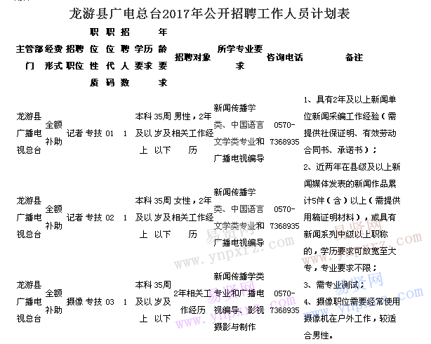 衢州市龍游縣廣電總臺(tái)2017年招聘工作人員計(jì)劃表