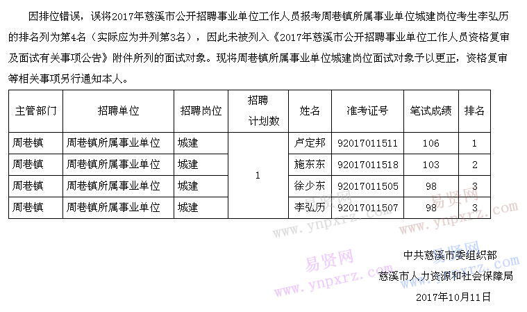 2017年寧波慈溪市更正周巷鎮(zhèn)所屬事業(yè)單位城建崗位面試對象名單公告