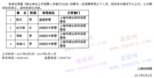 2017年上海動(dòng)物園擬錄用人員公示