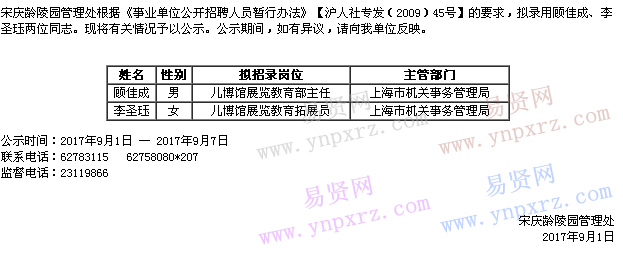 2017年上海市宋慶齡陵園管理處擬錄用人員公示
