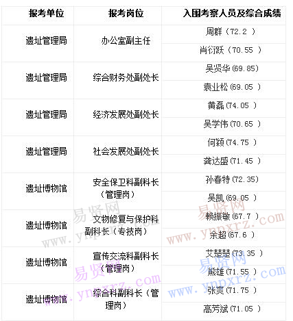 根據(jù)《公開選拔南昌漢代?;韬顕z址管理局、 南昌漢代?;韬顕z址博物館干部公告》要求,公開選拔干部筆試、面試工作已經(jīng)結(jié)束,根據(jù)考試總成績由高分到低分的順序排列,按1:2的比例依次確定入闈體檢和考察人選名單(入闈最后一名出現(xiàn)成績相同者一并列入)。現(xiàn)將總成績及入闈體檢和考察人選名單有關(guān)事宜的公布如下: