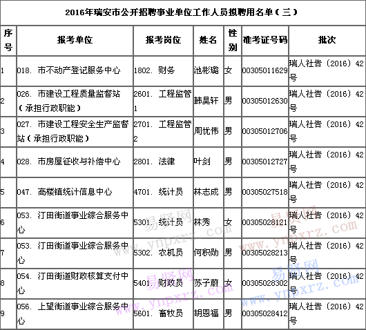 附件:2016年瑞安市公開(kāi)招聘事業(yè)單位工作人員擬聘用名單(三)