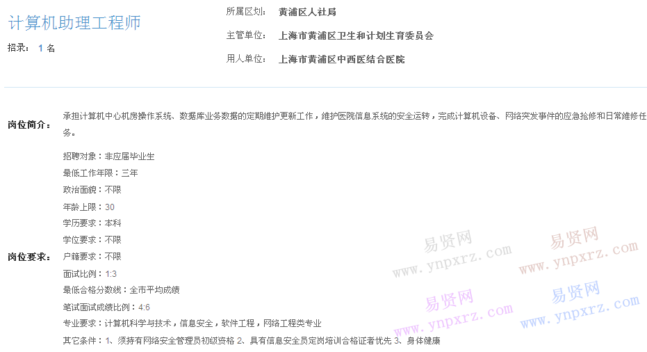 上海市2017年度事業(yè)單位招聘黃浦區(qū)崗位(中西醫(yī)結(jié)合醫(yī)院計算機助理工程師)