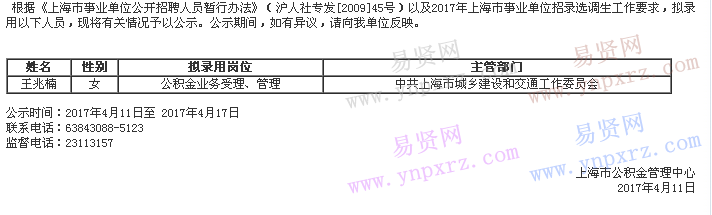2017年上海市公積金管理中心擬錄用人員公示