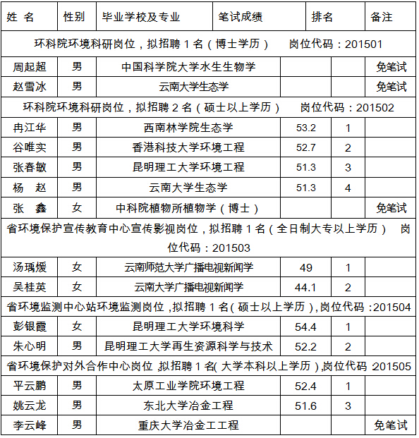 根據(jù)《云南省事業(yè)單位公開(kāi)招聘工作人員暫行辦法》(云人〔2004〕37號(hào))有關(guān)規(guī)定,現(xiàn)將省環(huán)境保護(hù)廳直屬事業(yè)單位2015年公開(kāi)招聘工作人員進(jìn)入面試人員公示如下: