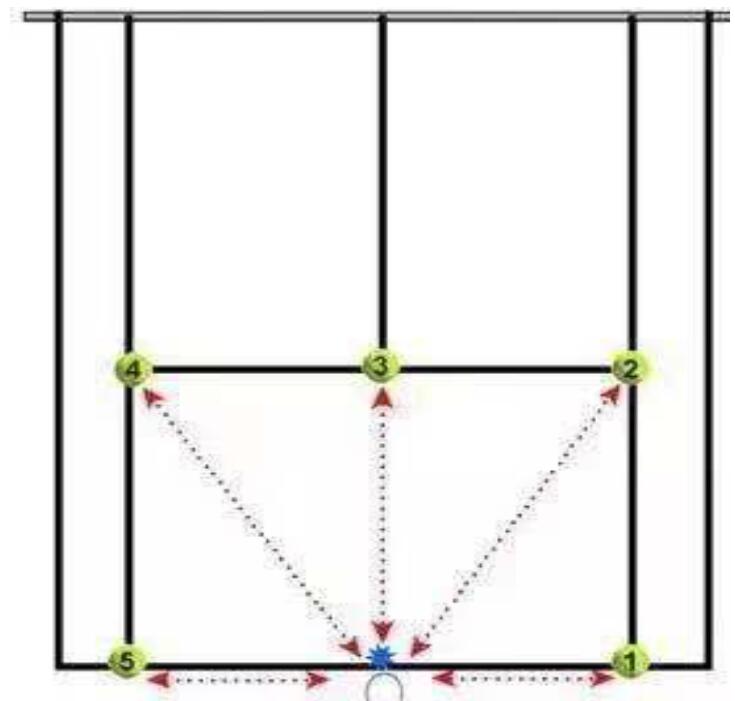 (三)扇形跑(20 分) 1.測(cè)試方法:將一支球拍放在底線中點(diǎn)后面,拍頭指向球網(wǎng),5 個(gè)球 的位置如圖所示。沿著逆時(shí)針方向依次取回 5 個(gè)球,將每次取回的球 放在球拍拍面上。測(cè)試員喊‘預(yù)備-開始’之后,秒表計(jì)時(shí)開始,記 錄完成時(shí)間。