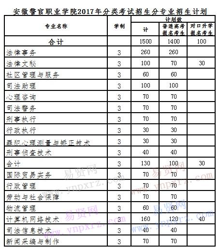 2017年我院分類考試招生總計劃為1500名,分17個專業(yè),文理兼收。具體分專業(yè)計劃見下表(以安徽省教育廳公布計劃為準(zhǔn)):