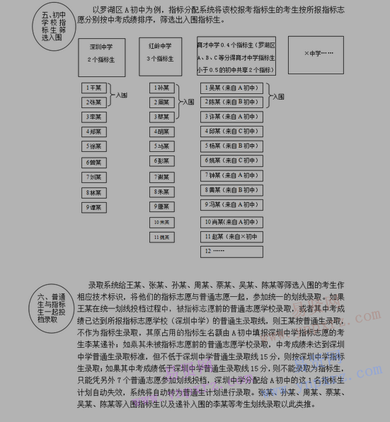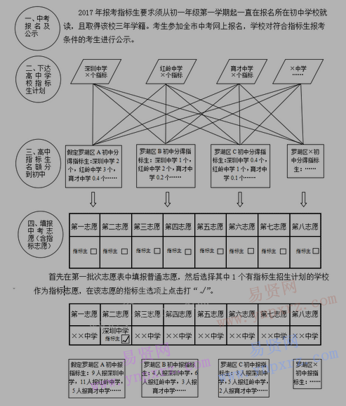 為幫助考生直觀形象地理解指標(biāo)生分配和錄取辦法,市招考辦制作了《深圳市2017年指標(biāo)生名額分配和錄取辦法示意圖》,考生可通過(guò)“深圳招考網(wǎng)”或《考生報(bào)考指導(dǎo)手冊(cè)》查閱。