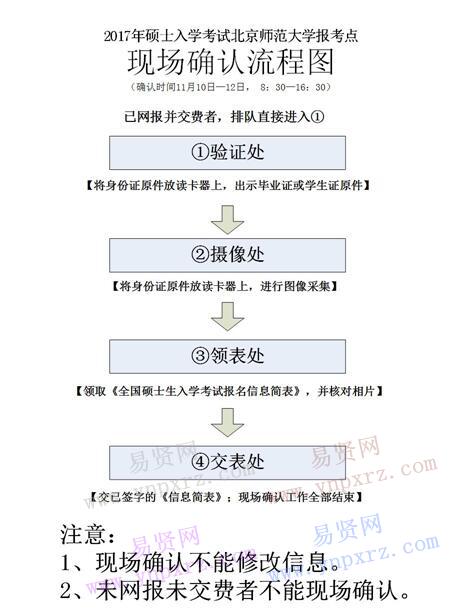 1.本報(bào)考點(diǎn)現(xiàn)場(chǎng)確認(rèn)對(duì)象為:網(wǎng)報(bào)時(shí)選擇“1127北京師范大學(xué)”報(bào)考點(diǎn),成功繳納報(bào)名費(fèi),就讀學(xué)校在北京的應(yīng)屆本科畢業(yè)生、單獨(dú)考試生、工作或戶口在北京的非應(yīng)屆考生(包括工商管理/公共管理/教育管理/項(xiàng)目管理等專業(yè)學(xué)位)。未網(wǎng)報(bào)及未交費(fèi)考生不得現(xiàn)場(chǎng)確認(rèn)。