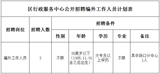 因工作需要,區(qū)行政服務(wù)中心擬面向社會(huì)公開(kāi)招聘編外工作人員,現(xiàn)將有關(guān)事項(xiàng)公告如下: