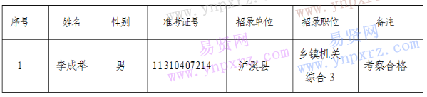 根據(jù)《湖南省2017年考試錄用公務(wù)員公告》和有關(guān)規(guī)定,2017年報(bào)考瀘溪縣鄉(xiāng)鎮(zhèn)機(jī)關(guān)綜合3的考生李成舉(準(zhǔn)考證號(hào):11310407214)考察合格,現(xiàn)將其作為擬錄用人員予以公示,公示期7天(10月23日-10月29日)。如有疑問(wèn),請(qǐng)于公示期內(nèi)與州人社局公務(wù)員管理局聯(lián)系。