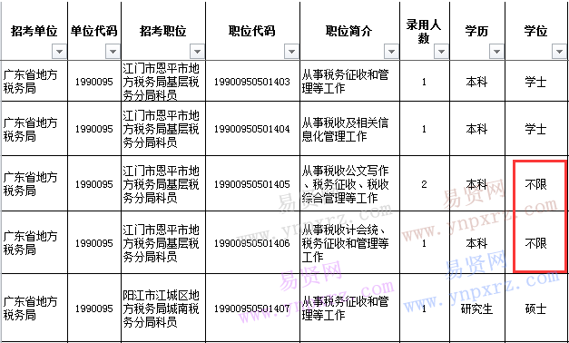 您好,你可以報(bào)考對(duì)于學(xué)位沒有要求的職位,但是可選擇的職位會(huì)比較少。如下表中的學(xué)位一列中注明“不限”的,就表示該職位對(duì)學(xué)位沒有要求,可以報(bào)考此類職位。