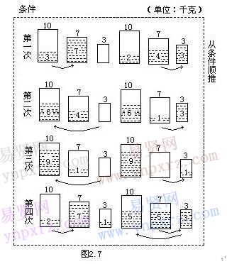 (2)按條件順推。第一次:10千克水倒入7千克桶,10千克水桶剩3千克水,7千克水倒入3千克桶,7千克水桶剩4千克水,3千克水桶里有水3千克;第二次:3千克桶的水倒入10千克水桶,這時10千克水桶里有水6千克,把7千克桶里的4千克水倒入3千克水桶里,這時7千克水桶里剩水1千克,3千克水桶里有水3千克;第三次:3千克桶里的水倒入10千克桶里,這時10千克桶里有水9千克,7千克桶里的1千克水倒入3千克桶里,這時7千克桶里無水,3千克桶里有水1千克;第四次:10千克桶里的9千克水倒入7千克桶里,10千克水桶里剩下 2千克水,7千克桶里的水倒入3千克桶里(原有1千克水),只倒出2千克水,7千克桶里剩水5千克,3千克桶里有水3千克,然后把3千克桶里的3千克水倒10千克桶里,因為原有2千克水,這時也正好是5千克水了。