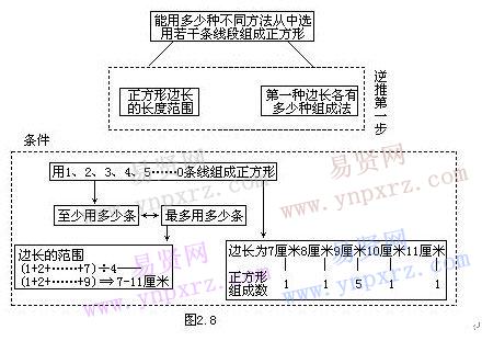 (1)逆推第一步。要求能用多少種不同方法,從中選用若干條線段組成正方形必須的條件是什么?