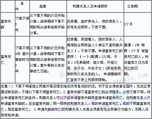 c、撤銷:被宣告失蹤的人重新出現(xiàn)或者確知他的下落,經(jīng)本人或者利害關(guān)系人申請(qǐng),法院應(yīng)當(dāng)撤銷對(duì)他的失蹤宣告。