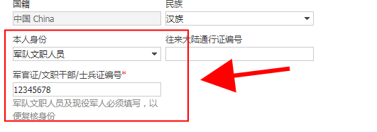 (二)現(xiàn)役軍人和部隊(duì)文職人員報(bào)名時(shí),須使用有效的居民身份證進(jìn)行申報(bào),在網(wǎng)報(bào)系統(tǒng)本人身份一欄中選擇相應(yīng)的“軍人”身份,并填寫相關(guān)的軍官證、警官證、文職干部證、士兵(官)證和軍隊(duì)學(xué)員證等證件號(hào)碼。