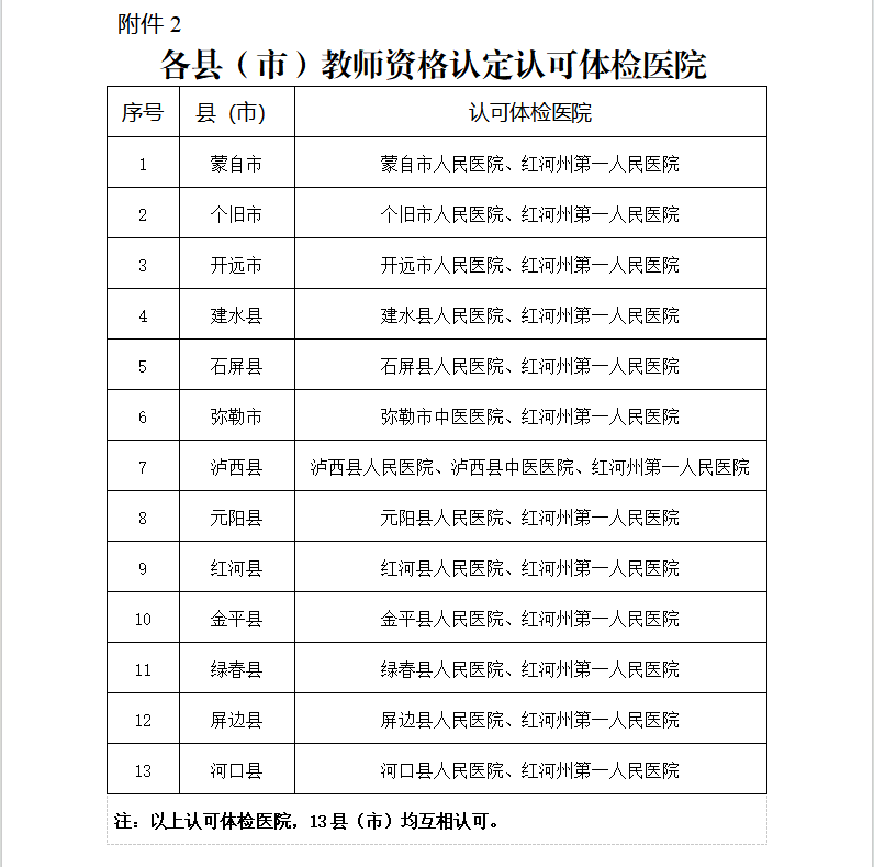 (7)《云南省申請教師資格認定人員體檢表》原件(見附件1)。經(jīng)紅河州轄區(qū)內(nèi)縣級以上公立醫(yī)院體檢后(認可體檢醫(yī)院詳見附件2),體檢結(jié)論簽署 “合格”且有體檢醫(yī)院意見并加蓋公章的《云南省教師資格認定體檢表》原件,體檢報告僅限當(dāng)次認定有效。