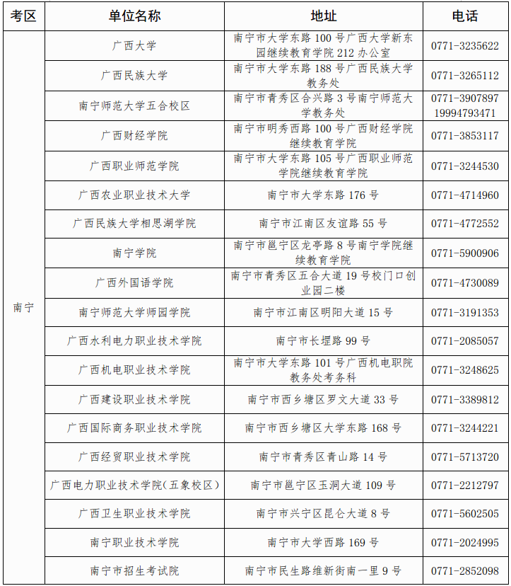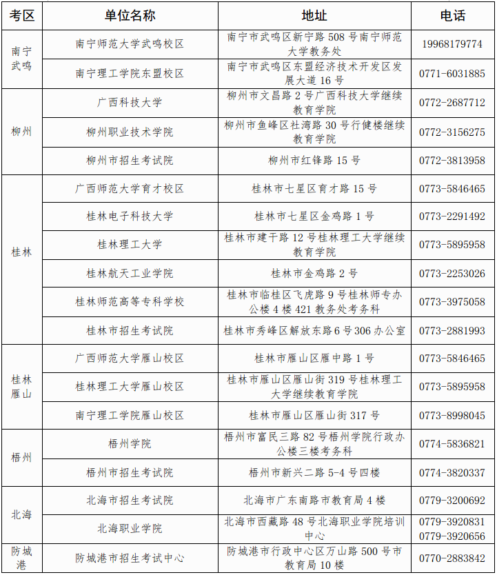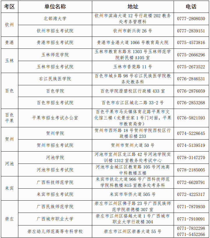 此次筆試共設(shè)17個考區(qū),分別為:南寧、南寧武鳴、柳州、桂林、桂林雁山、梧州、北海、防城港、欽州、貴港、玉林、百色、百色平果、賀州、河池、來賓和崇左。其中百色平果考區(qū)僅接受幼兒園、小學(xué)教師資格考試的報名。