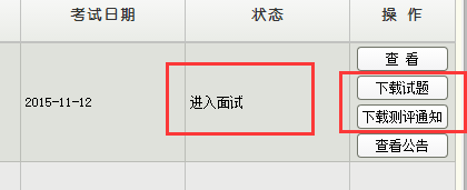 當考生通過資格審核并且繳費確認完成后,就能夠分配考場與考試時間,考場與考試時間分配完成后進入面試這個階段,登陸后就能看見下載測評通知書與下載測評文件的按鈕