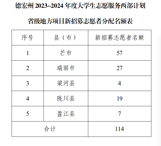 根據(jù)云南省項(xiàng)目辦下達(dá)德宏州2023-2024年度大學(xué)生志愿服務(wù)西部計劃省級地方項(xiàng)目服務(wù)規(guī)??偯~260名,其中,延期志愿者146名,德宏州擬新招募大學(xué)生西部計劃省級地方項(xiàng)目志愿者114名,具體請見名額分配表。