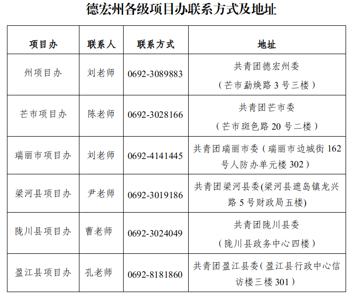 根據(jù)《共青團(tuán)中央、教育部、財政部、人力資源和社會保障部關(guān)于印發(fā)<2023-2024年度大學(xué)生志愿服務(wù)西部計劃實(shí)施方案>的通知》(中青聯(lián)發(fā)〔2023〕6號)及《共青團(tuán)云南省委、省教育廳、省財政廳、省人力資源和社會保障廳關(guān)于印發(fā)<2023-2024年度云南省大學(xué)生志愿服務(wù)西部計劃實(shí)施方案>的通知》(云青聯(lián)〔2023〕10號)文件精神,2023年德宏州大學(xué)生志愿服務(wù)西部計劃省級地方項(xiàng)目招募工作正式啟動。為選拔符合條件的普通高等學(xué)校應(yīng)屆畢業(yè)生或在讀研究生到我州基層參加西部計劃志愿服務(wù),現(xiàn)將德宏州2023-2024年度大學(xué)生志愿服務(wù)西部計劃省級地方項(xiàng)目志愿者招募工作有關(guān)事項(xiàng)公告如下。