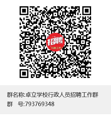 個人簡歷及報名表(報名表可以通過QQ群下載,也可以單擊文章左下角的“閱讀原文”下載。)發(fā)送至學校辦公室郵箱:qjyzzlxx@126.com,同時掃碼加入卓立學校行政人員招聘工作QQ群(如下所示)。