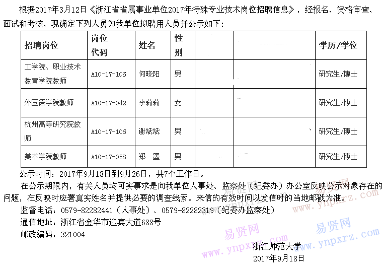 2017年浙江師范大學(xué)擬聘用人員公示