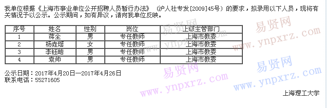 2017年上海理工大學(xué)擬錄用人員公示