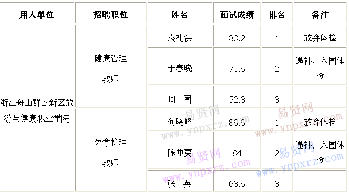 根據(jù)《2016年下半年浙江舟山群島新區(qū)人才儲(chǔ)備中心公開招聘專業(yè)人才》(2016年第21號(hào))規(guī)定,新區(qū)旅游與健康職業(yè)學(xué)院健康管理教師和醫(yī)學(xué)護(hù)理教師崗位于11月11日進(jìn)行面試并完成成績(jī)公告,第一名袁禮洪、何曉峰均因個(gè)人原因申請(qǐng)自動(dòng)放棄此崗位。按照相關(guān)規(guī)定,現(xiàn)由第二名于春曉、陳仲夷進(jìn)行遞補(bǔ)并作為入圍體檢對(duì)象,擇日安排體檢,特此公告。