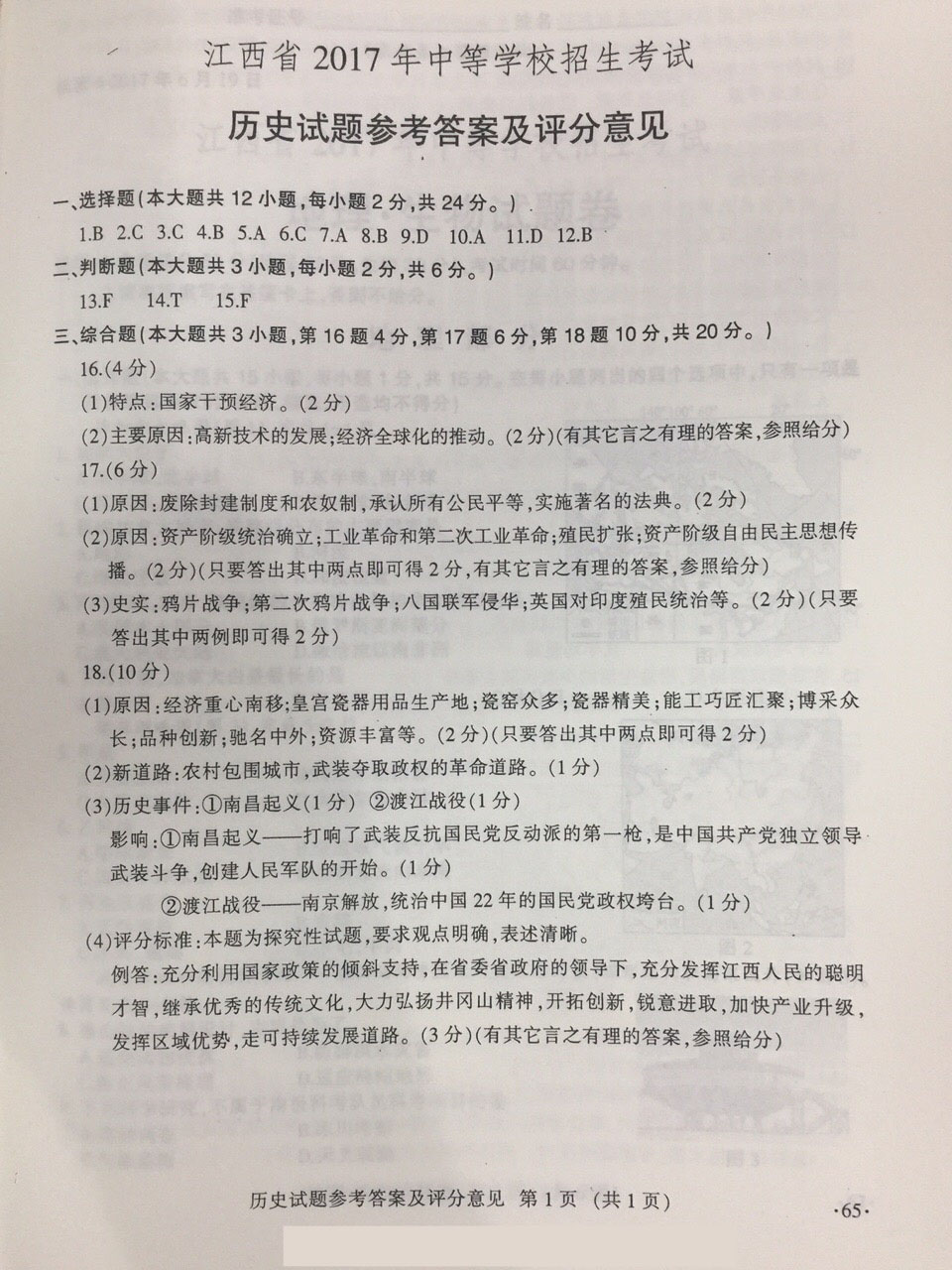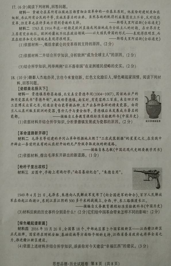 2017年江西上饒中考?xì)v史試卷及答案(已公布)
