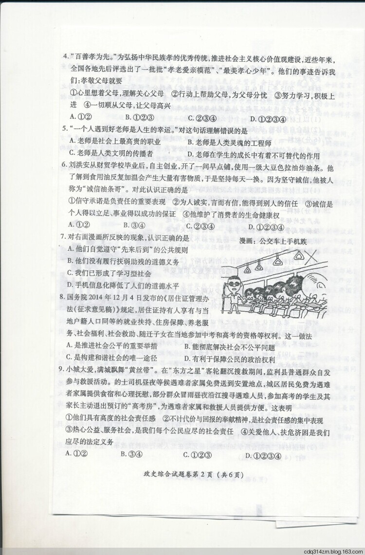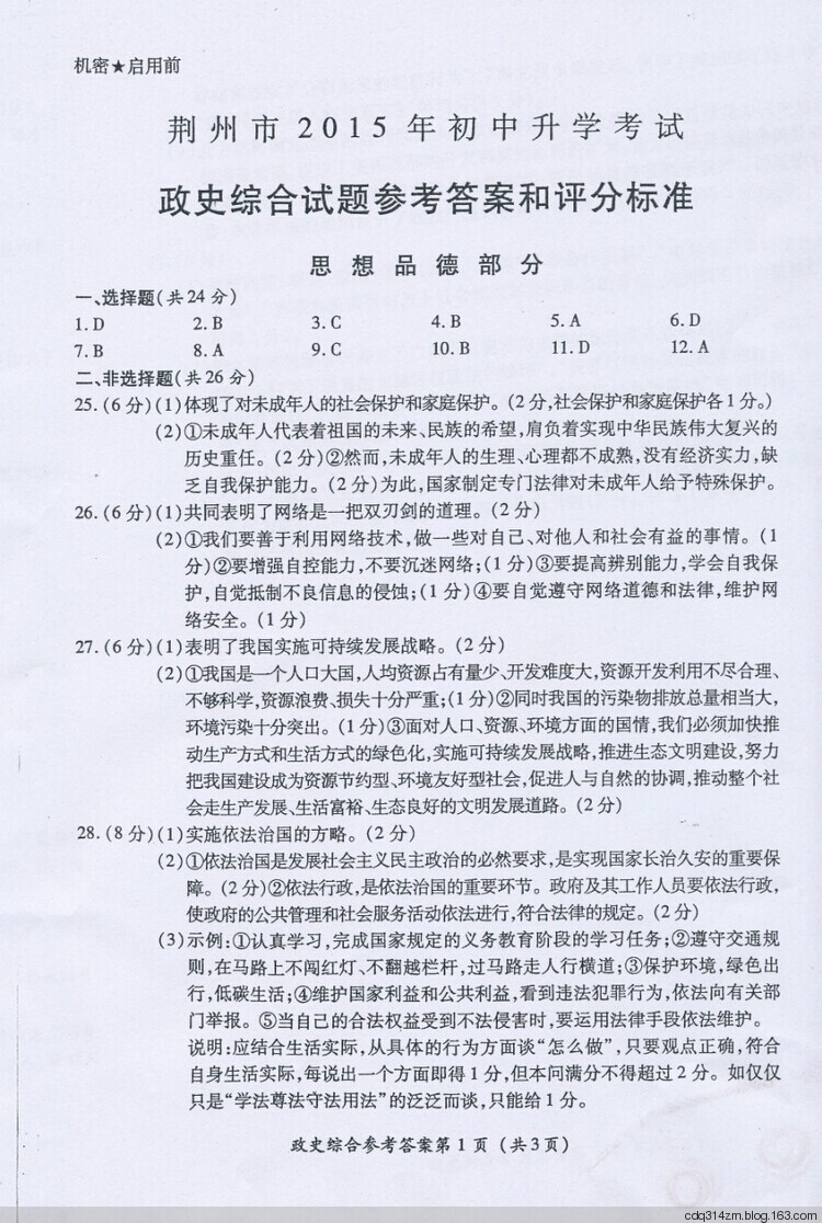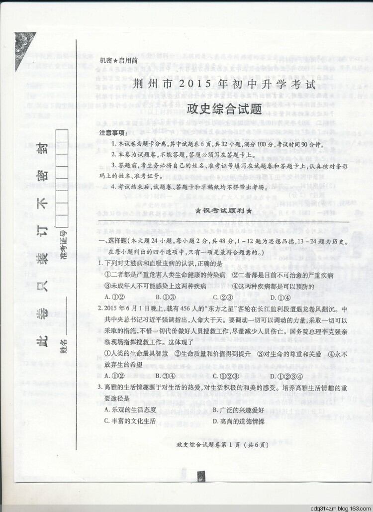 2015年湖北荊州中考政治試卷及答案(完整版)