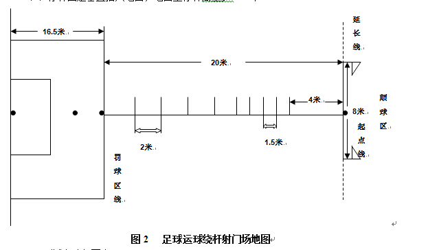 (2)從起點起沿20米垂直線插置標桿9支,第1支標桿距離起點4米。第1支標桿至第5支標桿距離6米,各標桿間距1.5米。第5支標桿至第9支標桿距離8米,各標桿間距2米。第9支標桿距離罰球區(qū)線中點2米。