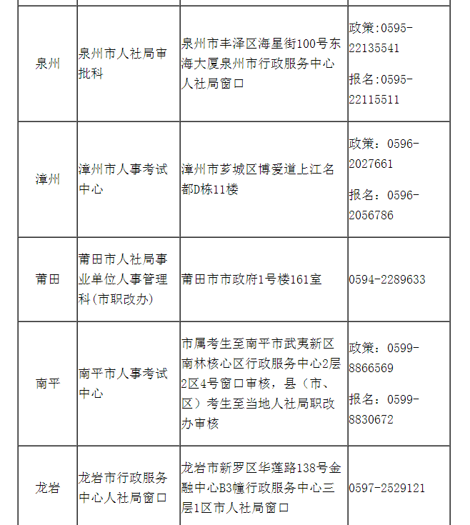 (六)領(lǐng)取證書時間:省直考區(qū)考生以福建省人事考試網(wǎng)通知的領(lǐng)證時間為準。各設(shè)區(qū)市考生向當?shù)厝耸侣毟牟块T或考試中心咨詢。省直考區(qū)委托省人社廳行政服務(wù)中心發(fā)放證書,泉州考區(qū)由泉州市人社局審批科發(fā)放證書,其余考區(qū)由所在地市人事考試中心發(fā)放證書。(省人社廳行政服務(wù)中心地址:福州市鼓樓區(qū)思兒亭路11號。各地市地址見附件:省直及地市人事考試機構(gòu)現(xiàn)場核查地址和咨詢電話)
