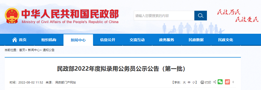 2022年民政部擬錄用國家公務(wù)員公示公告(第一批)已公布,為了方便廣大考生的查閱,下面為您詳細(xì)介紹一下本次擬錄用國家公務(wù)員公示的具體事宜,希望廣大考生及時關(guān)注,如有相關(guān)疑問,請關(guān)注國家公務(wù)員頻道為您實(shí)時做出的更新。