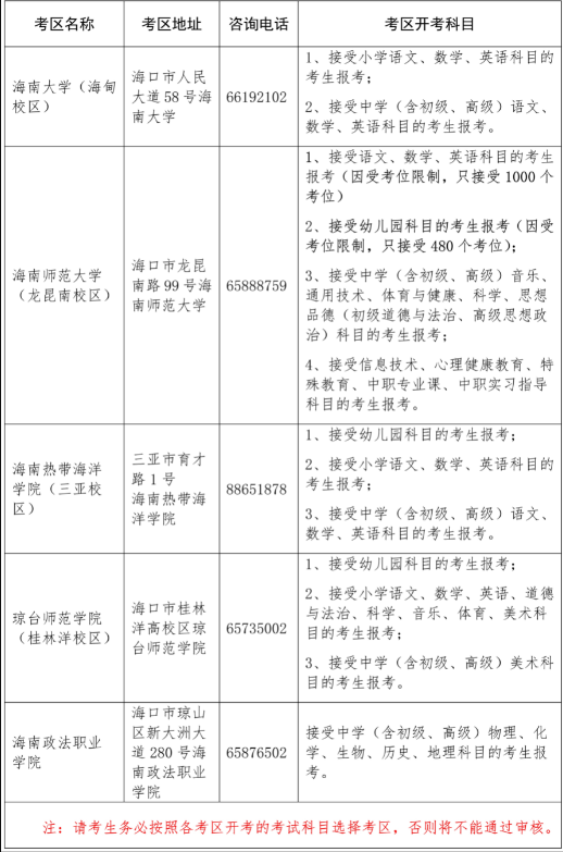 我省2023年下半年中小學(xué)教師資格考試(面試)共設(shè)海南大學(xué)(海甸校區(qū))、海南師范大學(xué)(龍昆南校區(qū))、海南熱帶海洋學(xué)院(三亞校區(qū))、瓊臺師范學(xué)院(桂林洋校區(qū))和海南政法職業(yè)學(xué)院等五個考區(qū),報名結(jié)束后各考區(qū)根據(jù)實際報名情況設(shè)置考點,考生參加考試的考點名稱與地址以準考證上的為準?,F(xiàn)將考區(qū)信息公布如下: